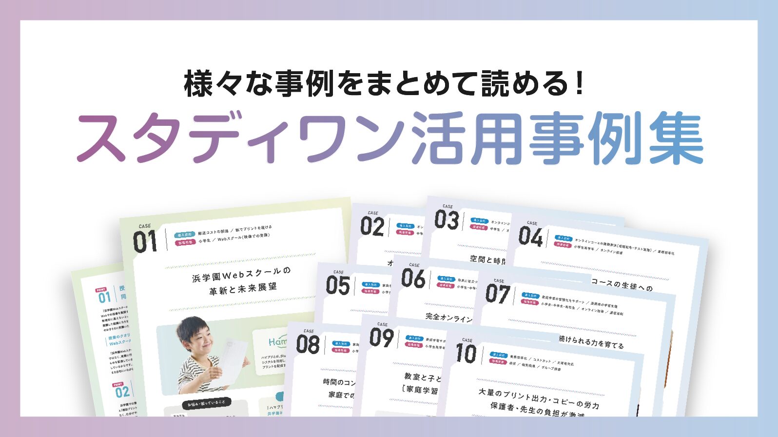 資料一覧 初めての方におすすめ! StudyOneについて 3分でわかる!スタディワン 初めての方におすすめ。スタディワンのしくみや活用例についてわかりやすく解説します。 この資料をダウンロード スタディワン活用事例集 多くの法人様からご好評いただいているスタディワンの活用事例を紹介します。 この資料をダウンロード スタディワンが目指す学習塾の未来 スタディワンの軸となっている『教育のデジタル化とIT革新』について対談形式で解説します。 この資料をダウンロード